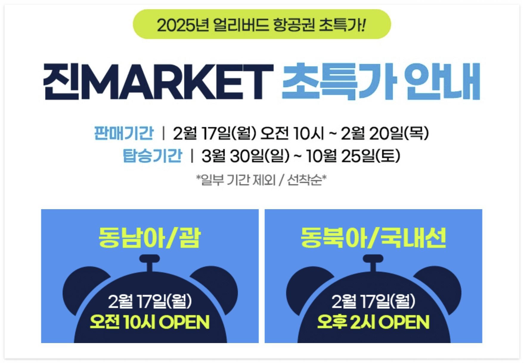 진마켓은 진에어에서 연중 두 번 진행하는 대규모 할인 프로모션으로, 국내선과 국제선 항공권을 최대 96%까지 할인된 가격에 제공하는 행사입니다. 이번 상반기 진마켓은 2025년 2월 17일(월)부터 2월 20일(목)까지 총 4일간 진행되며, 탑승 기간은 2025년 3월 30일부터 10월 25일까지입니다. 진마켓 예약하기