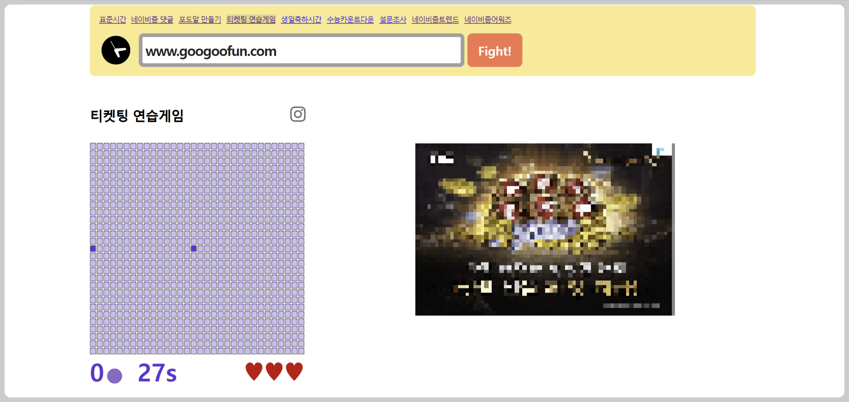 구구펀은 클릭 속도 및 반응 속도를 테스트하며 티켓팅 연습을 도와주는 사이트입니다.